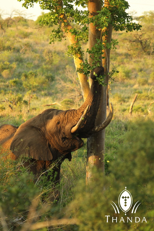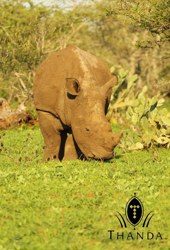 These three pictures of Giraffes on the savanna, a White Rhino on a grassy hill top and an Elephant bull in between Fever trees show Thanda animals in their “new juicy” environment.