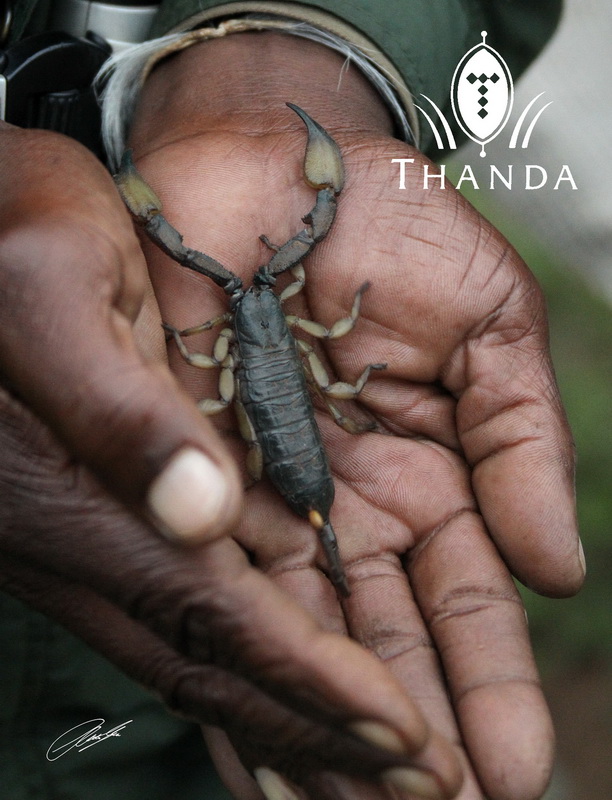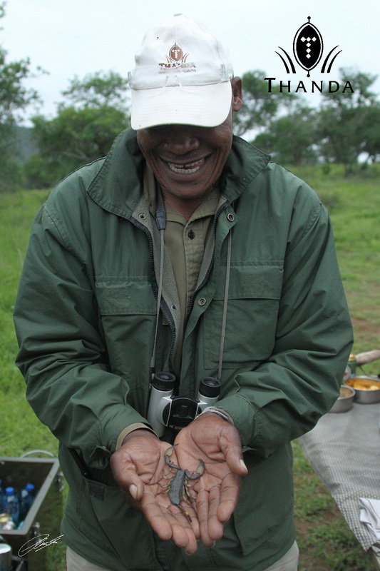 In the third picture Bheki shows a (harmless) Scorpion to our guests during a drink stop at sundown.