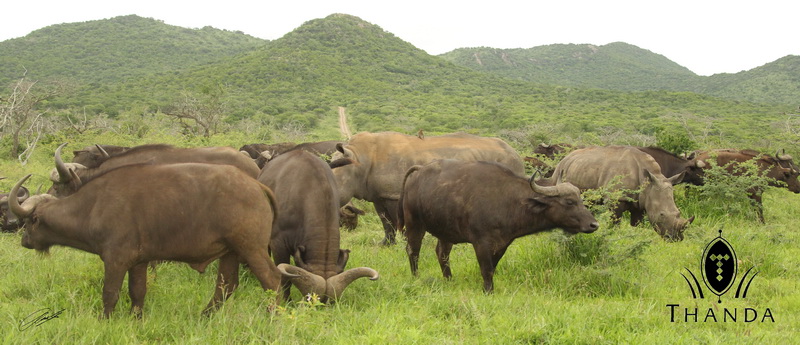 We were watching a herd of Buffalo having a rest in the grass when two White Rhinos (mother and calf) moved right in between and started chasing the Buffalo around.