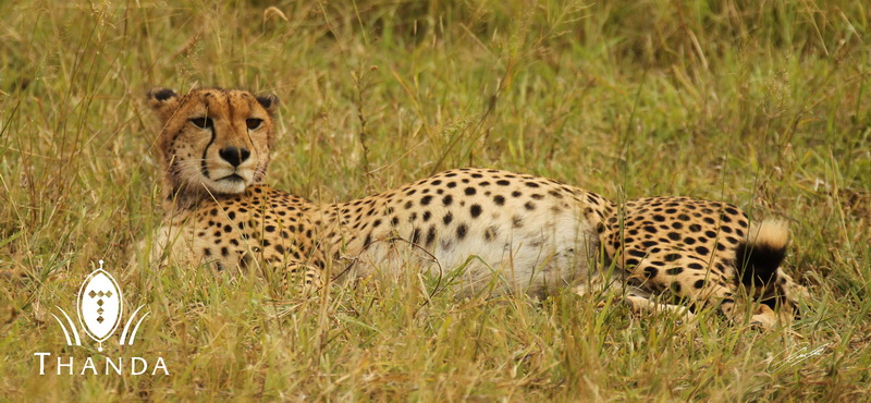 This was the first time that I saw our two male Cheetahs on a kill. They often hunt in very thick areas and only appear once they are well fed, far away from the actual kill. On this occasion they brought down a baby Zebra on the savanna. In this picture one of the brothers is keeping watch while the other one still feeds on the carcass.