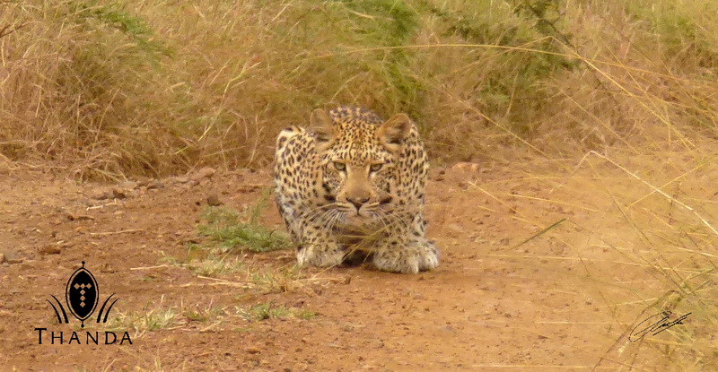 This young female Leopard was standing in the road when I drove towards the Thanda Royal Private Villa. She was curious and waited for me to get closer. She then turned around and walked in front of me for a while before she disappeared into the bush.