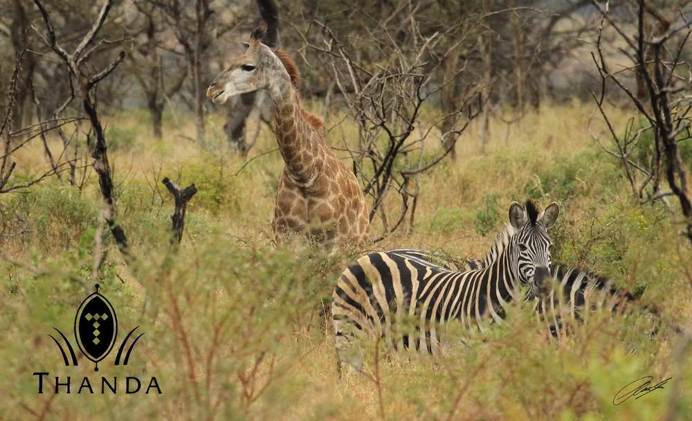 This afternoon we had some winter rain. Despite the unusual wet weather for this season the Thanda guests enjoyed great game drives with Elephant bulls, a herd of Buffalo and this young Giraffe (in Zebra company).
