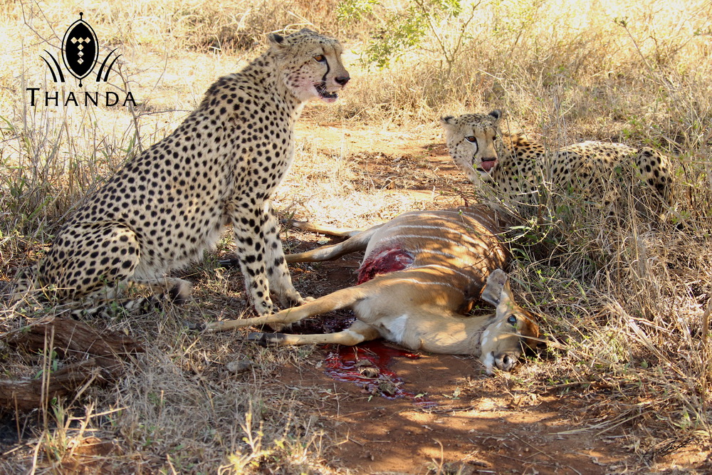 Thanda’s two male Cheetah killed a female Nyala. The pictures shows them right after they started their meal.