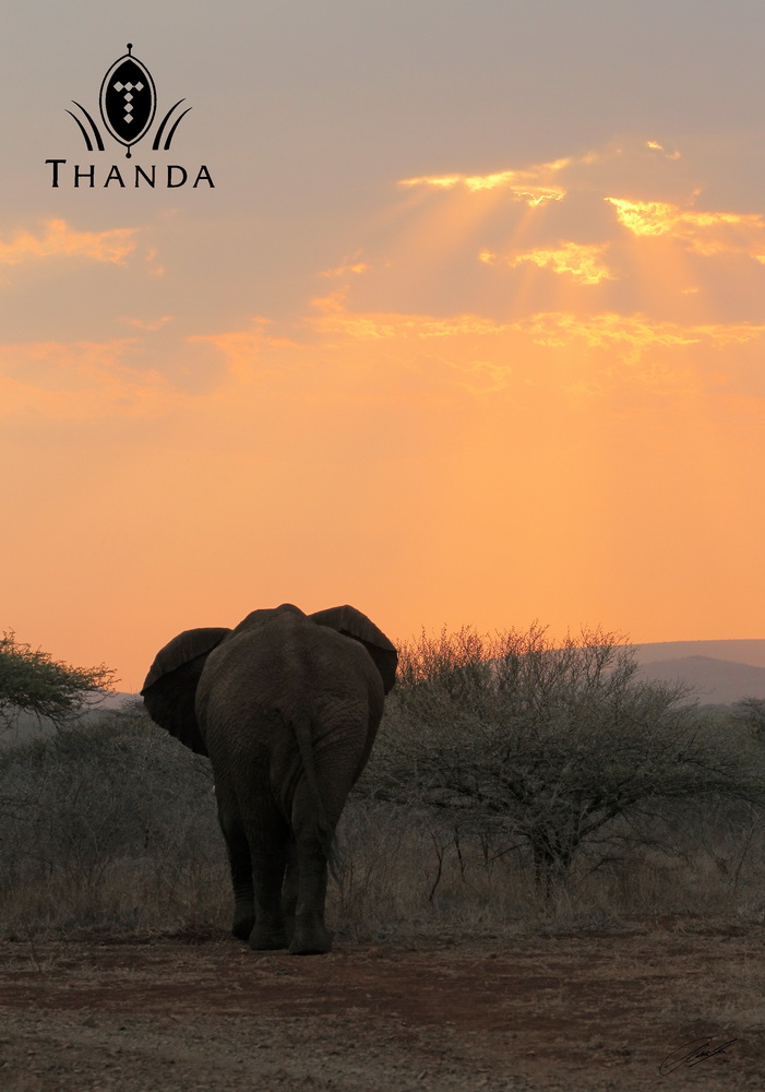 One of Thanda’s oldest Elephant bulls walked quietly towards the sunset. Before he disappeared in the bush he provided the Thanda guests a very close encounter with a gentle giant.