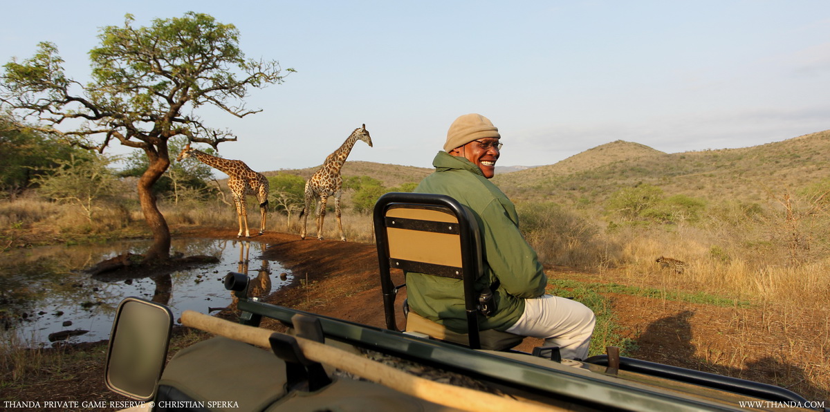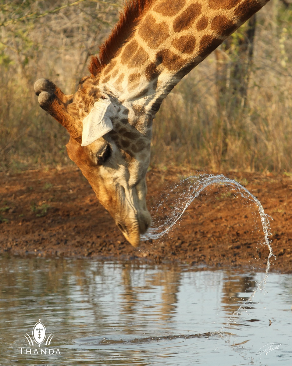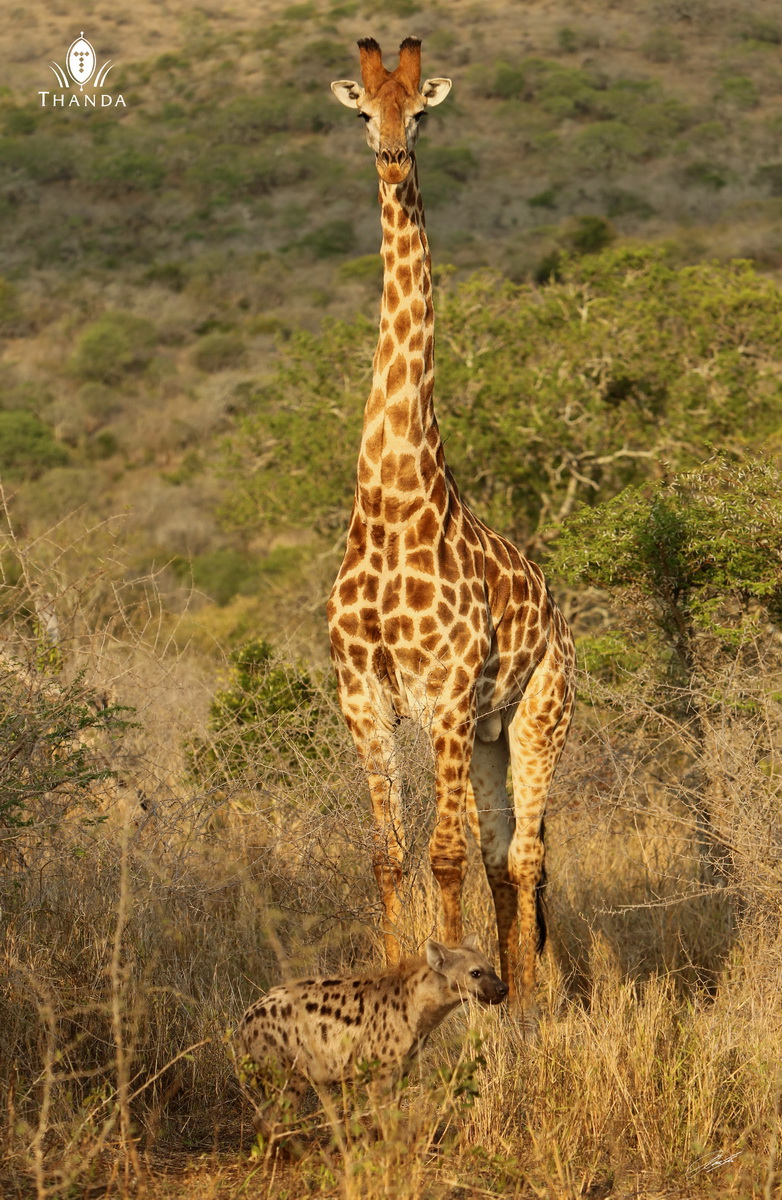 At the small waterhole in front of Thanda’s Villa iZulu a Spotted Hyena and a journey of Southern Giraffe met and interacted for almost an hour. This image shows Bheki in between the actors in this early morning drama.