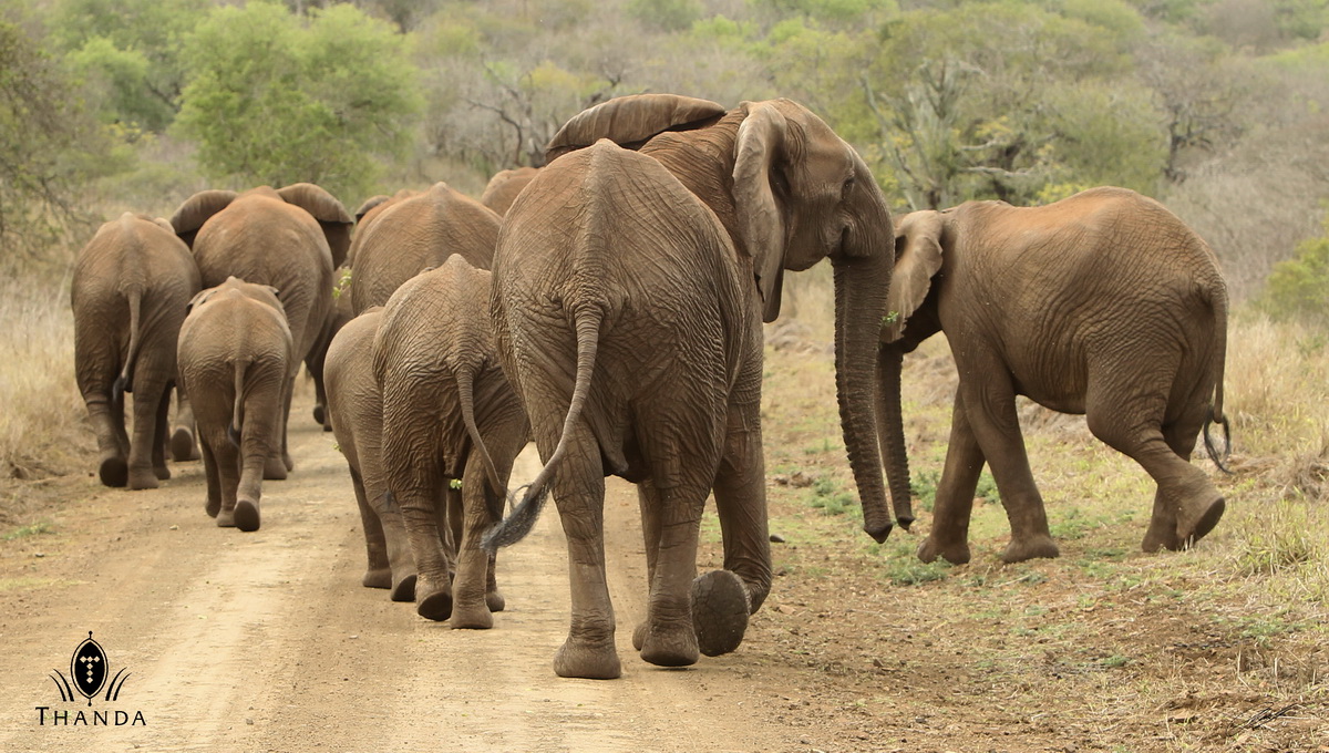 … We left after watching this scene for almost an hour – On the way back to Thanda’s Safari Lodge we ran into an Elephant road block. The matriarch was having an eye on us while we followed the herd slowly until they made their way through the bush to another waterhole. What a morning!