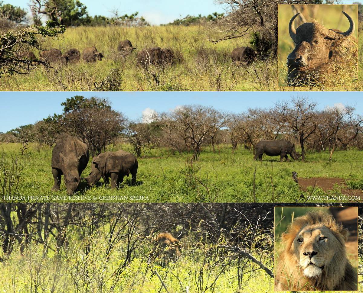 At one time we could see all three “Big Five” species from one spot : looking to the left > the Lions / looking straight on > the Buffalo / looking to the right > the Rhinos.
