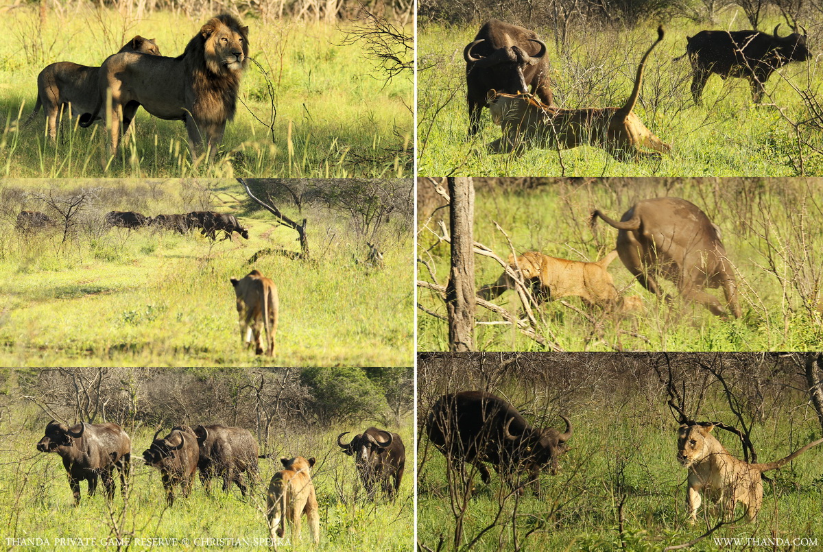 We had some great sightings this morning – First a herd of Buffalo enjoying themselves at a Waterhole, then four Lions trying to hunt some Buffalo and finally three White Rhino enjoying the sun after a mud bath. The guests on my vehicle were especially impressed with the Lion-Buffalo interaction. It was not always clear who was the hunter, and who the hunted? The Lions gave up at the end and the Buffalo moved on.