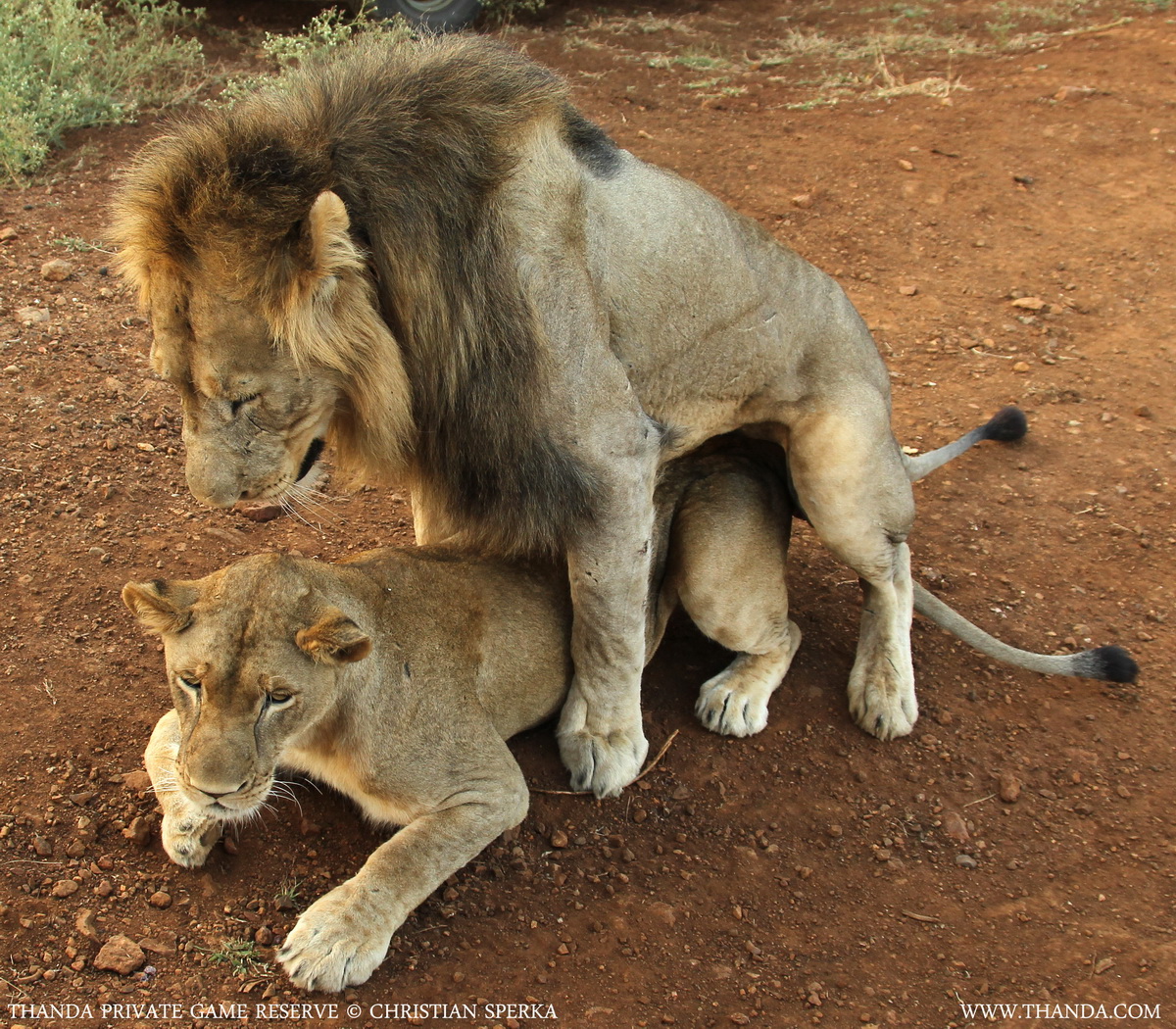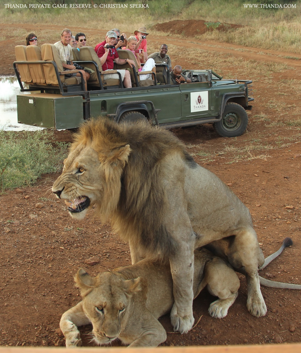 As we were watching a male and a female Lion at a Waterhole they both got up and started walking between two game drive vehicles. In front of the astonished Thanda guests they started mating. A common procedure in a not so common place. I was about 2 meters (10 feet) from the Lions when I took the picture – In the right place at the right time 🙂