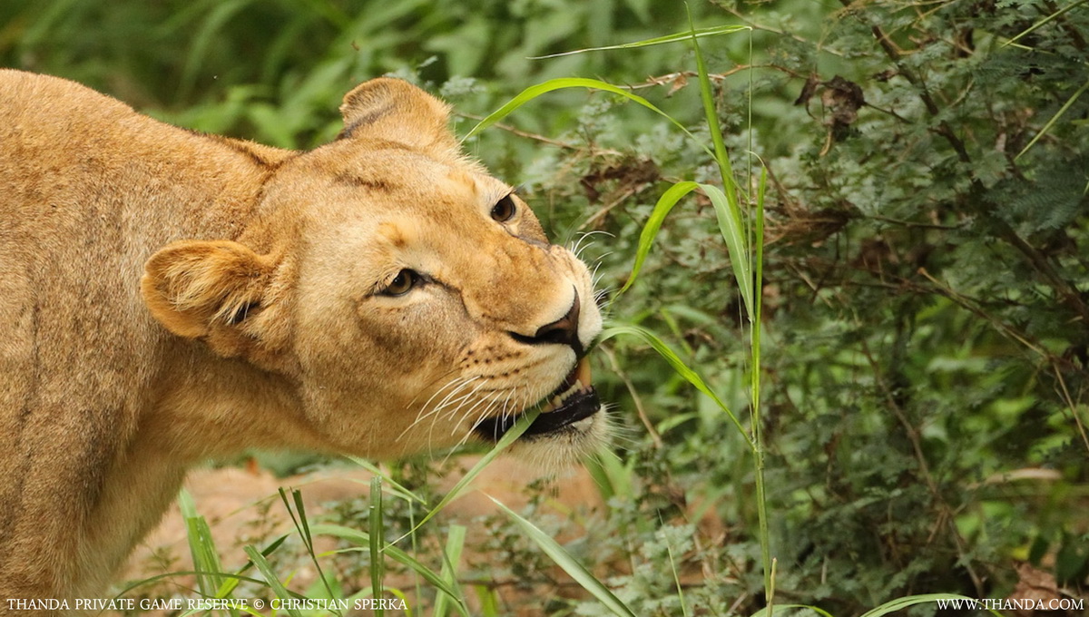 But this Thanda Lioness nibbled on grass for quite a while. That sort of behavior can mostly be observed after heavy meals, apparently to help with a full or upset stomach.