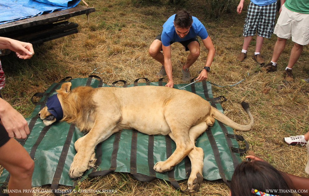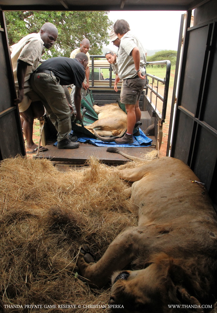 Loading the Lion on a vehicle for the ride from the boma to the transport vehicle.