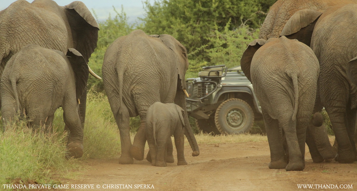 … it depends. Thanda’s experienced guides and trackers know when to move and when to stay. In this case there was plenty space for the Elephants and all of them were very relaxed as they moved past the vehicle. So the guests were able to enjoy a close encounter with these gentle giants.