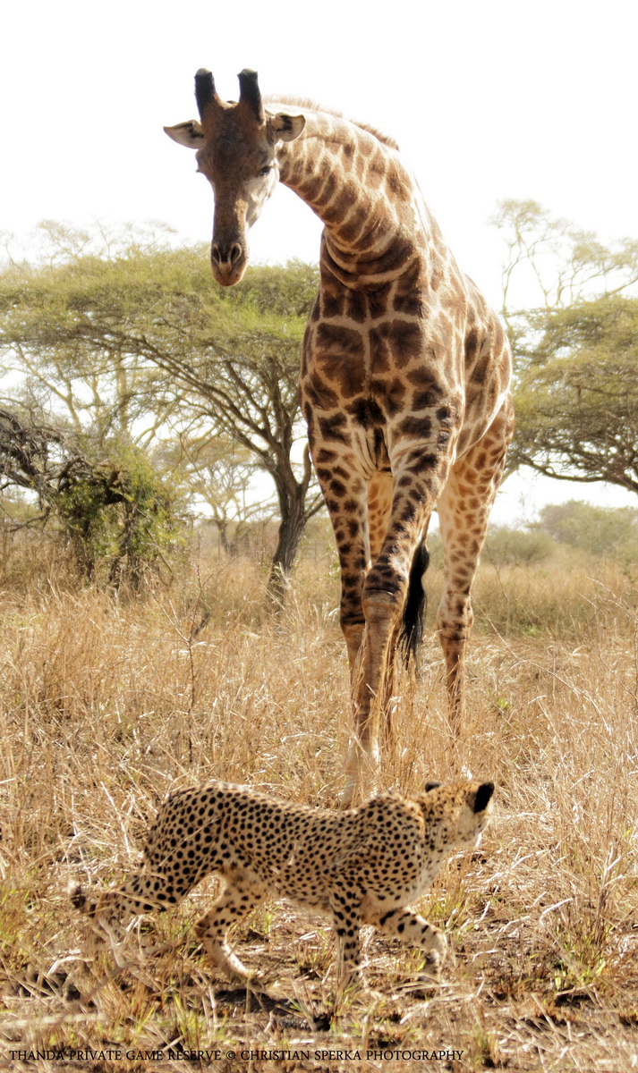 One of Thanda’s male Cheetahs got quite a fright when this Giraffe bull approached and bent his long neck to get a good look. A second after this picture was taken, both of them bolted in opposite directions 🙂