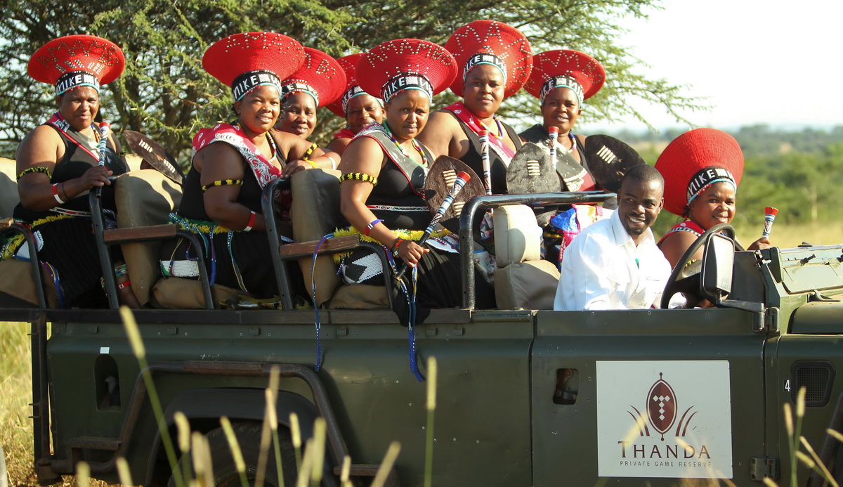 This picture shows a choir of Zulu Mamas (=married ladies) in their traditional attire on the way to the Thanda Safari Lodge to perform for the Thanda guests a few of the songs which are part of such celebrations.