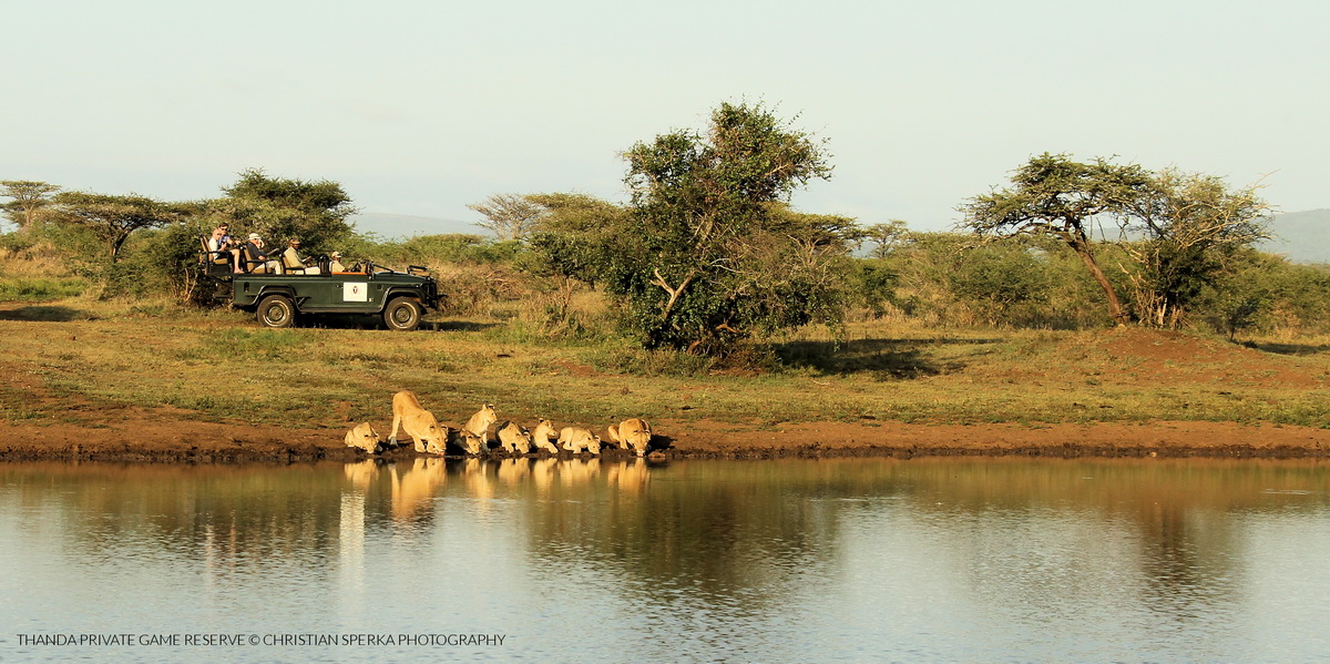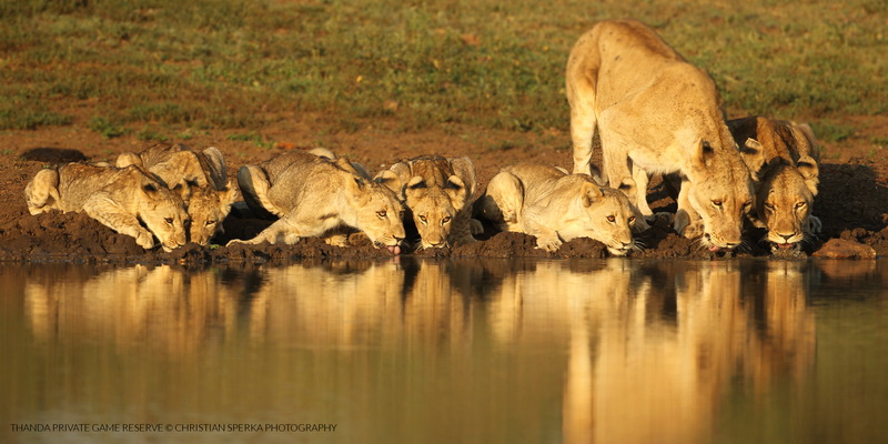 Thanda’s North Pride of Lions having a drink at a waterhole. Watching animals near water is always a special treat on any game drive. Encountering a pride of Lions in the morning sun quenching their thirst is an exceptional experience!