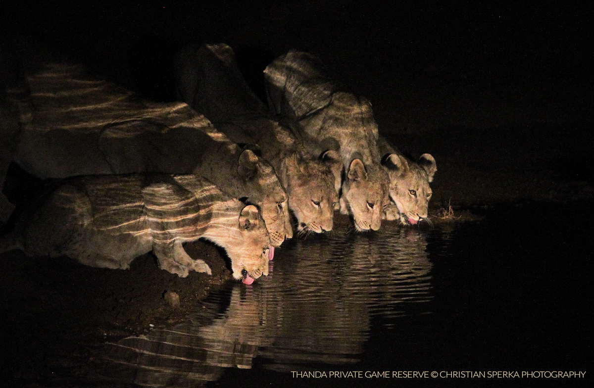 An interesting Lion sighting! Thanda’s North Pride having a late evening drink at a small waterhole, only illuminated by the spotlight reflection.