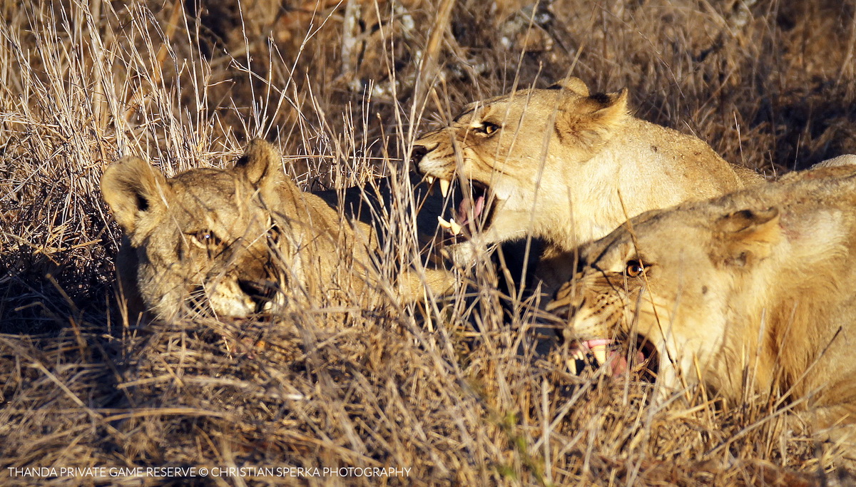 This picture shows Thanda’s South Pride (A mother with her daughter and her son) growling at Thanda’s dominant male Lion.