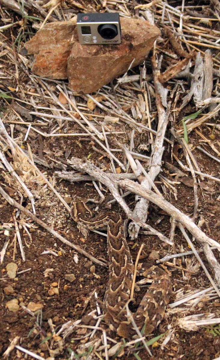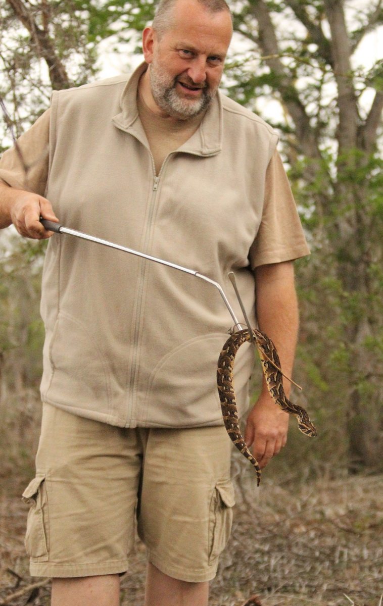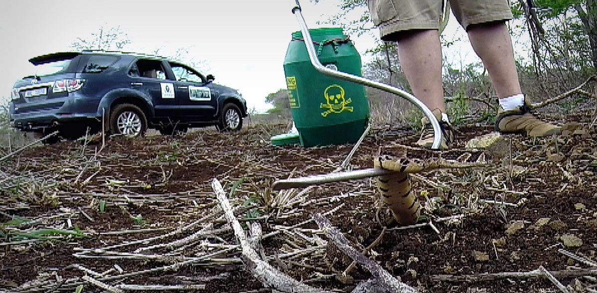 This picture shows me transferring the Puff Adder from the transport barrel to nice spot on the ground (near some undergrowth).