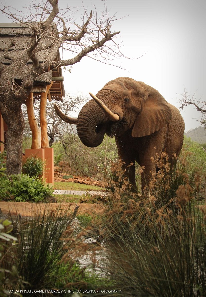 This picture shows one of the two largest Elephant bulls on Thanda drinking right next to the Lodge reception area.