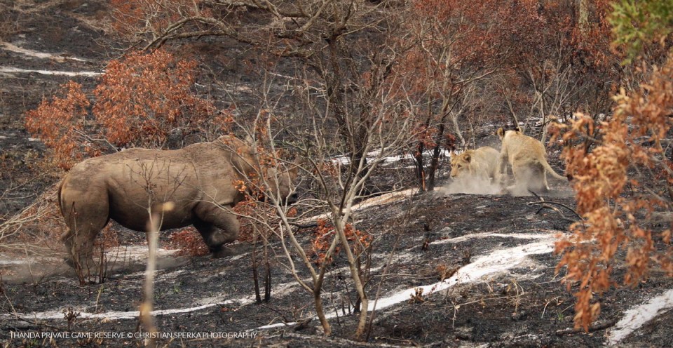 Rhino chasing Lions