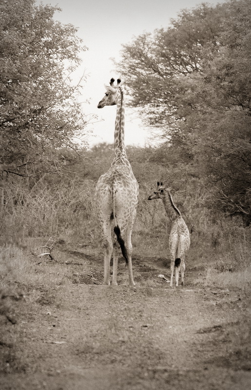The sun had just set when we encountered this Thanda Giraffe with her small calf. We followed the two for a while until they disappeared into the thick bush. The quality of these low light images is not perfect, but they capture the mood of this great sighting.
