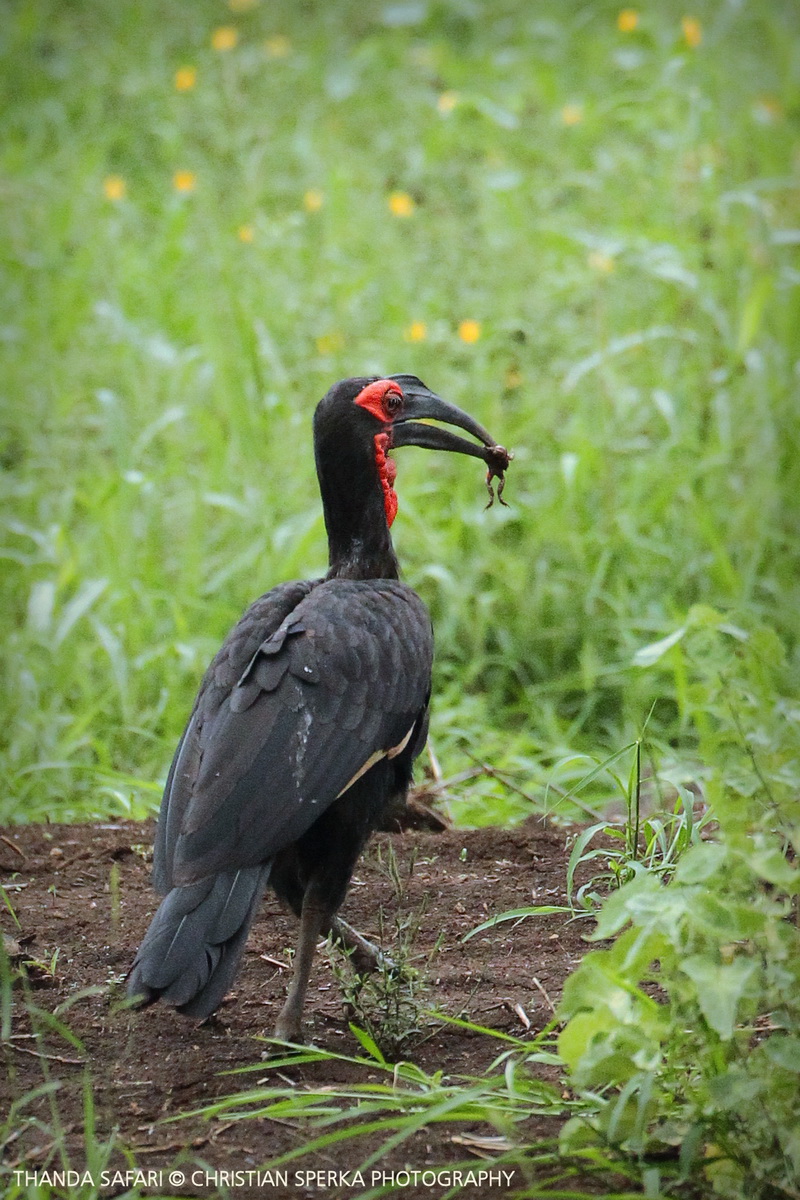 The Southern Ground Hornbill is one of South Africa’s endangered bird species. Its conservation status is ‘threatened – vulnerable’. Yesterday this beautiful specimen of the largest species of Hornbill was foraging together with its mate on Thanda Safari. A very exciting sighting for all the Thanda Safari bird lovers.