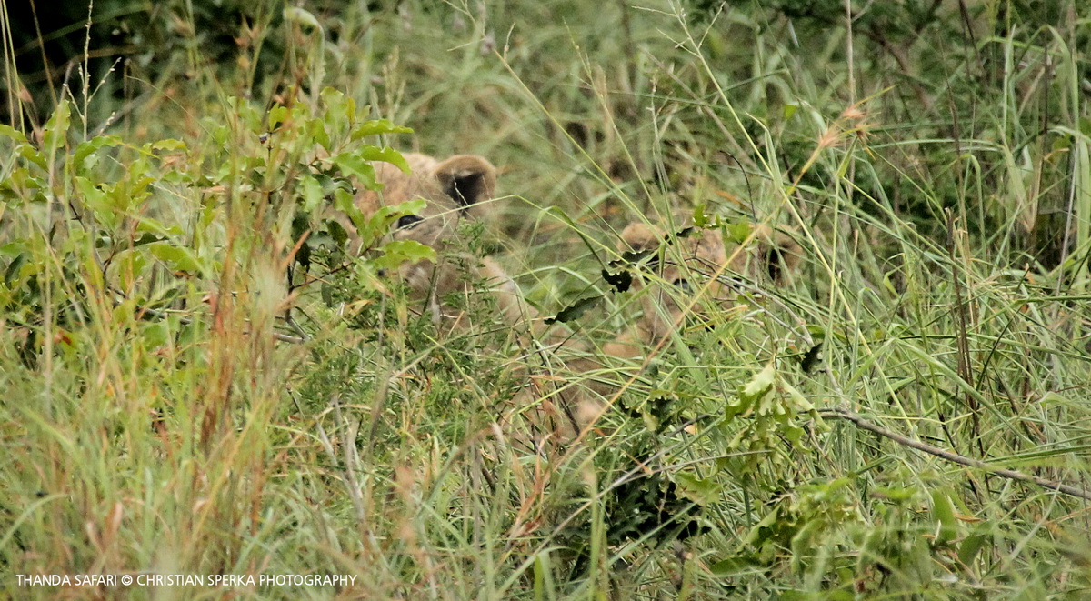 During yesterday morning’s game drive we spotted the newest additions to the Thanda South Pride of Lions (seen for the first time, ever). The mother must have introduced the two cubs (+/- 2 month old) very recently to the Pride. The two youngster were very shy at their first vehicle encounter and went into thick bush to wait for the ‘large unknown animal’ to disappear. I was able to take two images before they moved off. Very soon they will get used to the vehicles, observing their mum’s reaction – or lack thereof – to our game viewers. I am sure there will be great sightings to come!