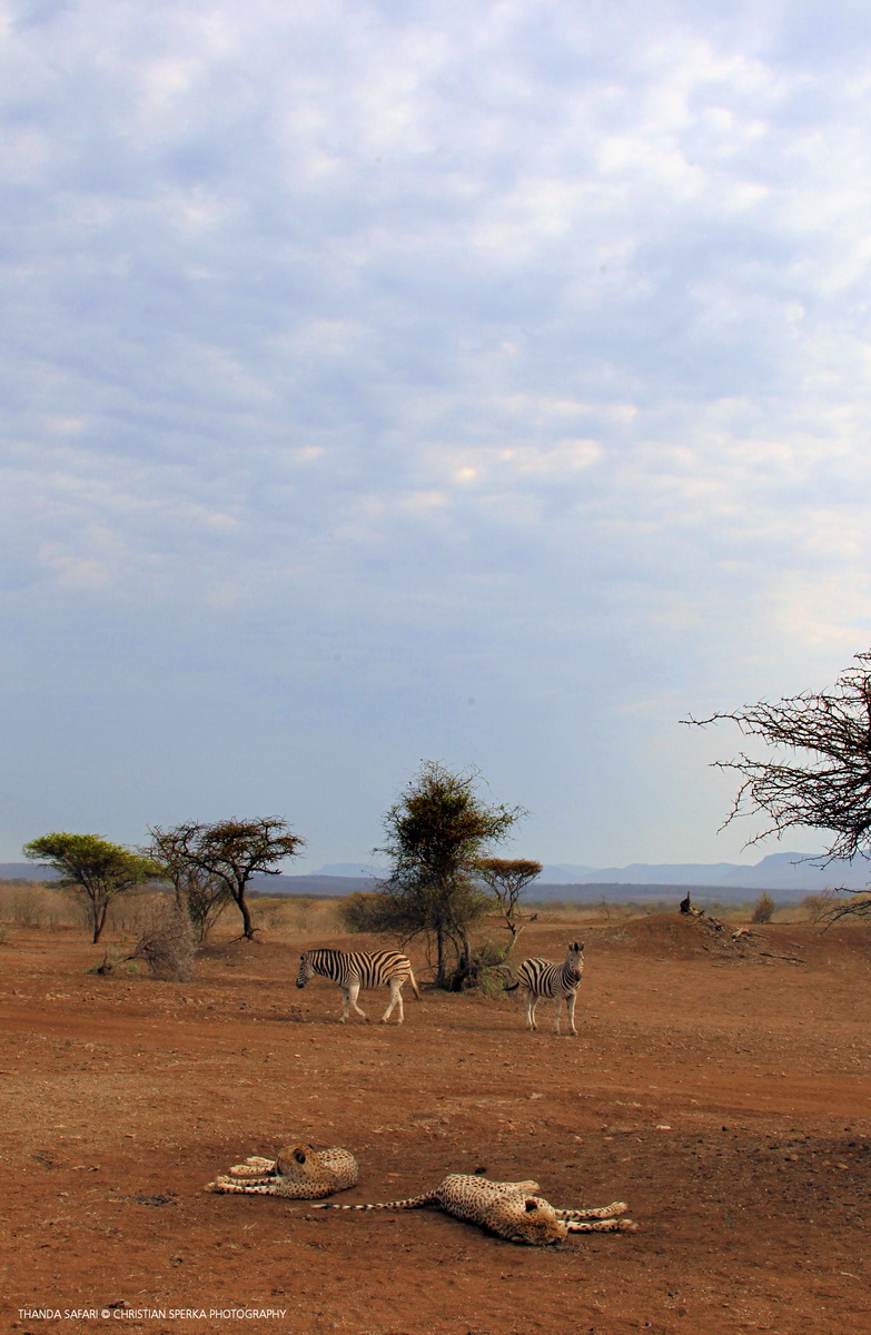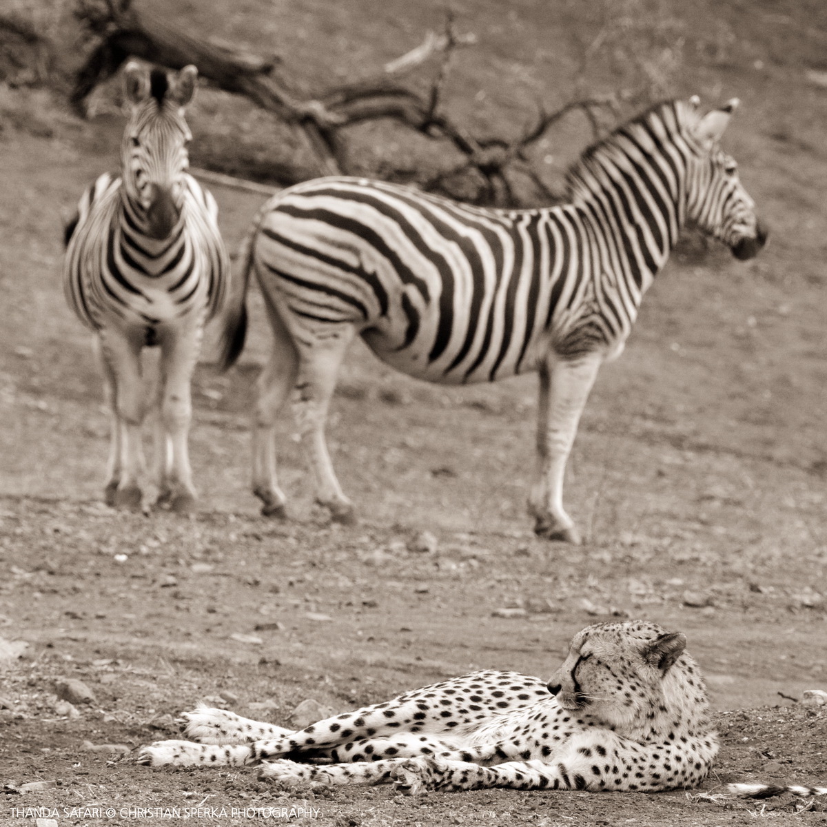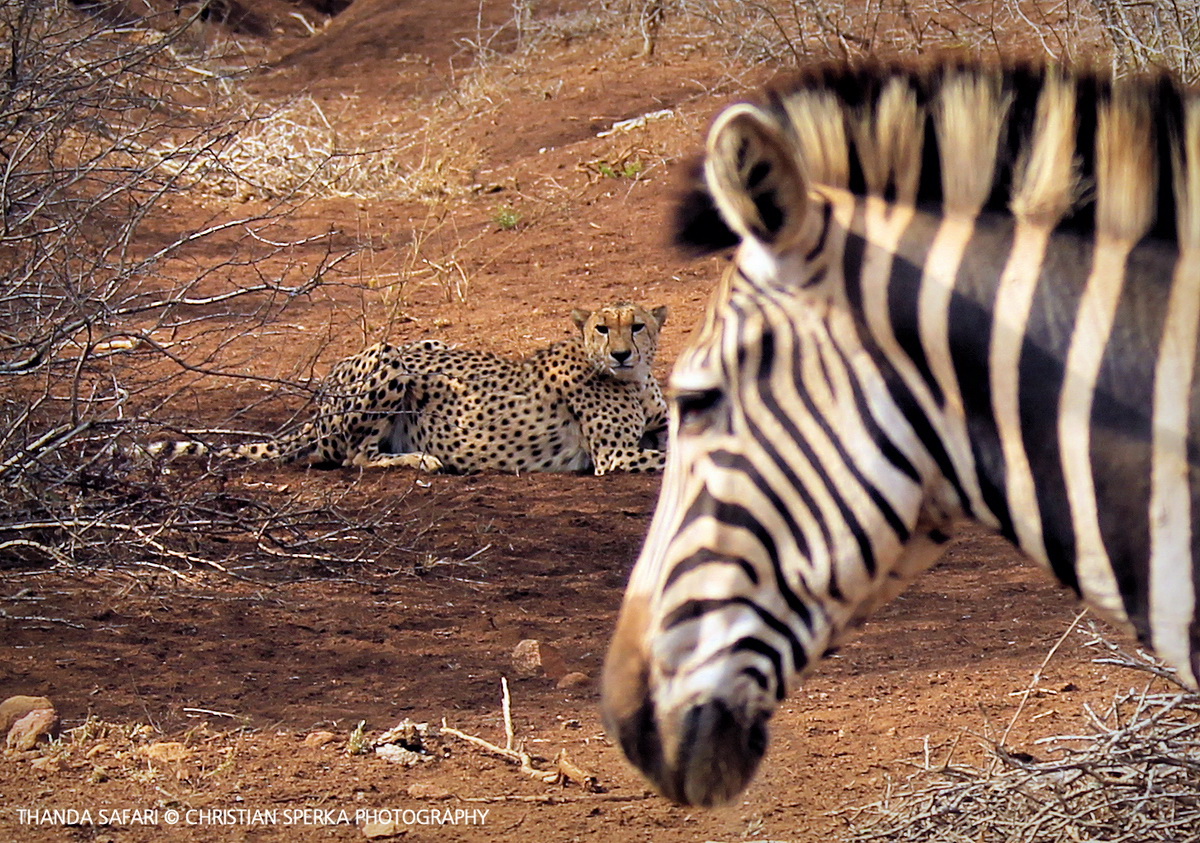 But the Thanda Safari guests enjoyed a sighting of two Cheetah males ignoring a dazzle of Zebras. Adult Zebras are too large as prey for Cheetahs. These Zebras in turn ignored the Cheetahs after an initial hesitation. They went to drink at a nearby waterhole in peace and quiet.