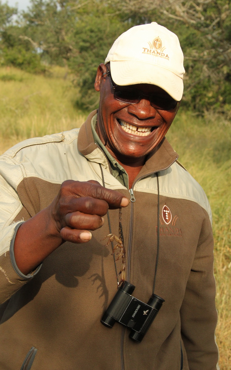 Bheki Ngubane, one of Thanda Safari’s experienced trackers, often shows our guests a scorpion during the morning drink stop. As everyone enjoy their coffee, tea or hot chocolate Bheki has a look around the area for a scorpion resting under a stone. He will pick it up – carefully – by the tail and bring it over for everyone to have look. Bheki and I often let these small predators sit and walk on our hands. When the ‘show and tell’ is finished Bheki replaces the eight-legged creature back in its home, under the stone!